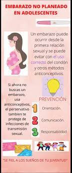 Aspectos que favorecen el embarazo en la adolescencia: De acuerdo a la literatura revisada, los factores de riesgo se ordenan en las dimensiones individual, familiar y social. a) Factores individuales Dificultad para planear proyectos a largo plazo personalidad inestable, baja autoestima y poca confianza, sentimiento de desesperación, falta de actitud preventiva, menarquia precoz, conducta de riesgo, abuso de alcohol y drogas abandono escolar dificultad para mejorar sus condiciones de vida, insuficientes dificultades por integrarse a grupos de entretenimiento antecedentes familiares, familia conflictivas o en crisis madres que han estado embarazadas en la adolescencia. Biológicos El uso de los métodos de planificación en los adolescentes las expone a un embarazo a edades tempranas. Menarquia La edad de la pubertad a declinado desde los 17 años en el siglo XIX alrededor de 12 a 13 años, actualmente lo que conduce a que la a...